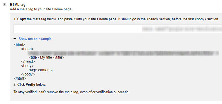 If you have access to the site and are familiar with site code, you can upload an HTML meta tag to the site’s home page. Copy the code and be sure to place it within the head section. It doesn’t matter where it is placed so long as it is visible within the head section, as shown in the example. Never delete this code from your site as your site will become unverified.
