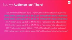 So if you still think your audience isn’t there, well with the beauty schools, we know your age demographic is between 18 and 35 and 18 to 35 year olds make up over 50% of Facebook’s total ad audience. So I hope this is convincing you here. This is where we need to be if our true objective with social advertising and putting money into social advertising is to get leads and conversions, this is where we should be focused. If anything, at least to run a top funnel campaign on Facebook to gather as much people into our audience as possible and remarket them on other platforms. So that’s our goal here.