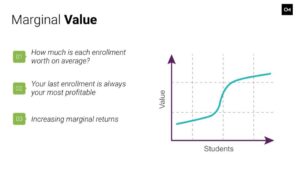 So we’ll talk about both of those, but we’re going to talk first about the marginal profit. So understanding this value is going to help you work backwards. You’re basically going to take that value and spread it across how many leads you need to get that enrollment and figure out that value. But the tricky thing with this is that the marginal value or the marginal profit of each enrollment is not always the same, it tends to move. Every class has a fixed cost associated with it, right?