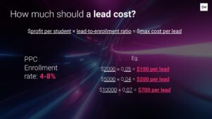 So now, I’m going to go over a couple of examples with this just so that you can get a sense of what this is supposed to look like. So I’m just going to make up the numbers for the profit per student, and then I’m going to use a few different rates here for the PPC enrollment. But let’s say that you know the profit you’re going to make off of your next enrollment is $2,000. If you multiply that value by your lead to enrollment ratio, I’m just going to use 5% because in this range here, you’ll find that the maximum cost per lead is $100. That’s the highest allowable cost per lead you should accept until you’ve enrolled that student. Anything over $100 and you won’t make any money back or you won’t make the money back that you’ve invested into the leads. But as long as your cost per lead is below that mark, then you’re making a positive return on your investment.