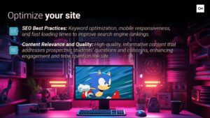 All right. Then this tip here, optimize your website. Keyword optimization, make sure it’s mobile responsive. That’s old hat news and if you haven’t done that yet, please contact us. We’ll get you a mobile optimized website. Fast loading times. Nobody has time. In this day and age, everyone expects that your websites load like that. They’re ready to jump. How many times have you tried to visit a website, it doesn’t load for two seconds and you’re like, “It doesn’t work. I’m out.” Then have high quality, informative content on your side. Last year we talked a lot about blogs and how important those are and how they can actually help you make revenue. That is something that is still relevant today. We want to have those prospective students’ questions and concerns answered. This enhances the time spent on site, enhances engagement, it gives a lot of metrics for things that they want to do.